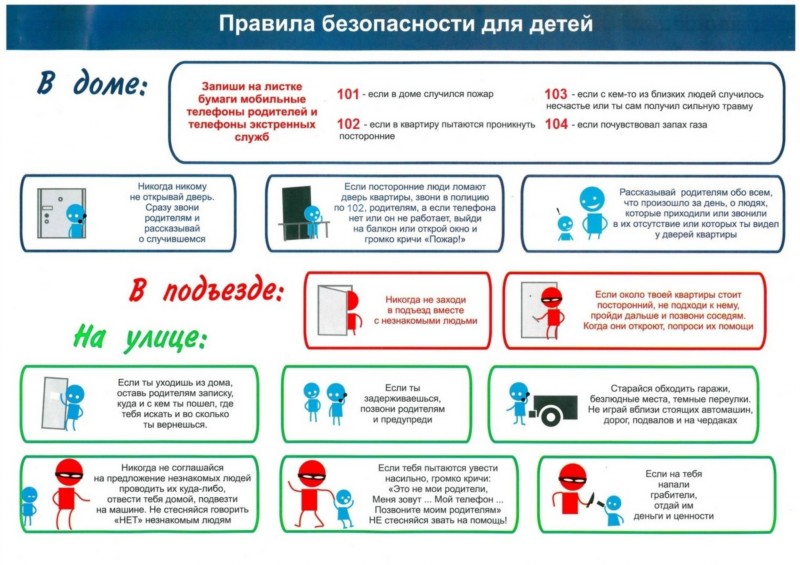 Посторонним и незнакомым дверь НИКОГДА не открывай, даже если они представляются соседями, полицейскими, врачами (если сам не вызывал).